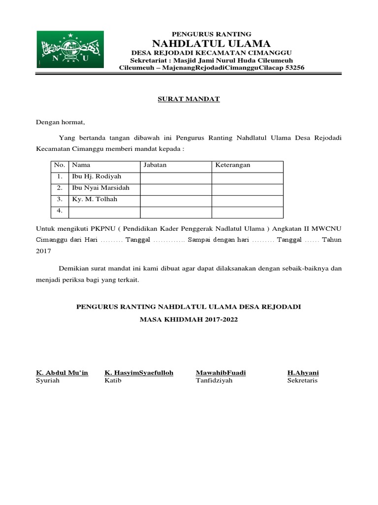 Contoh Surat Mandat Ipnu Pdf Document from reader015.docslide.net We are a sharing community. Kami juga sudah sediakan contoh surat perintah tugas pdf di bawah ini yang bisa anda download dan pergunakan sendiri. Berikut ini dapat sobat download contoh surat lamaran kerja guru paud, tk, sd, mi, smp, sma, smk, bimbel, yayasan, honorer yang masih kuliah sekalipun berbentuk doc maupun pdf. Beberapa diantaranya adalah surat tanda terima. Download contoh surat mandat dengan mengklik link berikut Pemerintah kabupaten mojokertodinas pendidikansekolah dasar negeri seduri 2jl. Please copy and paste this embed script to where you want to embed. Savesave contoh surat mandat for later.
